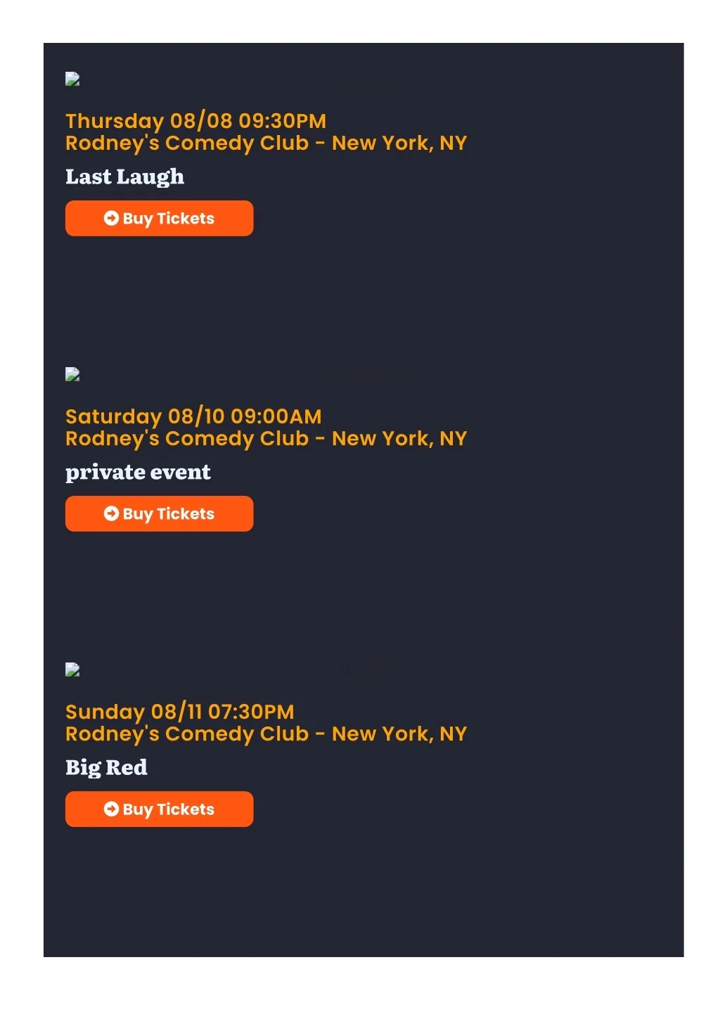 Last Laugh Thursday 08/08 09:30PM Rodney's Comedy Club - New York, NY Last Laugh Buy Tickets private event Saturday 08/10 09:00AM Rodney's Comedy Club - New York, NY private event Buy Tickets Big Red Sunday 08/11 07:30PM Rodney's Comedy Club - New York, NY Big Red Buy Tickets