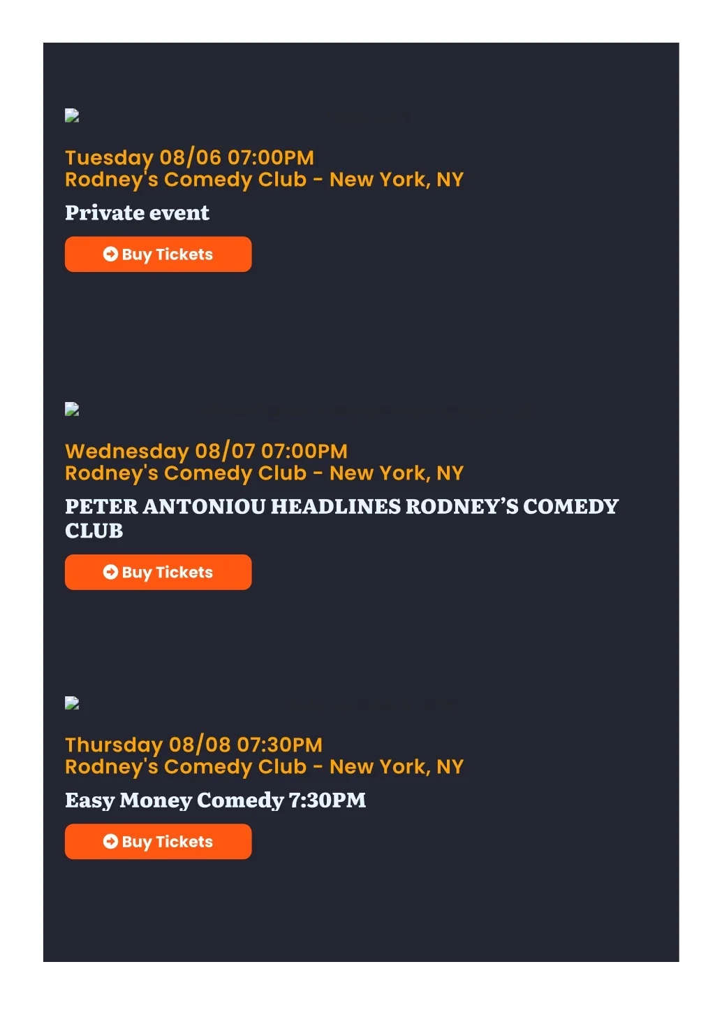 Private event Tuesday 08/06 07:00PM Rodney's Comedy Club - New York, NY Private event Buy Tickets PETER ANTONIOU HEADLINES RODNEY’S COMEDY CLUB Wednesday 08/07 07:00PM Rodney's Comedy Club - New York, NY PETER ANTONIOU HEADLINES RODNEY’S COMEDY CLUB Buy Tickets Easy Money Comedy 7:30PM Thursday 08/08 07:30PM Rodney's Comedy Club - New York, NY Easy Money Comedy 7:30PM Buy Tickets