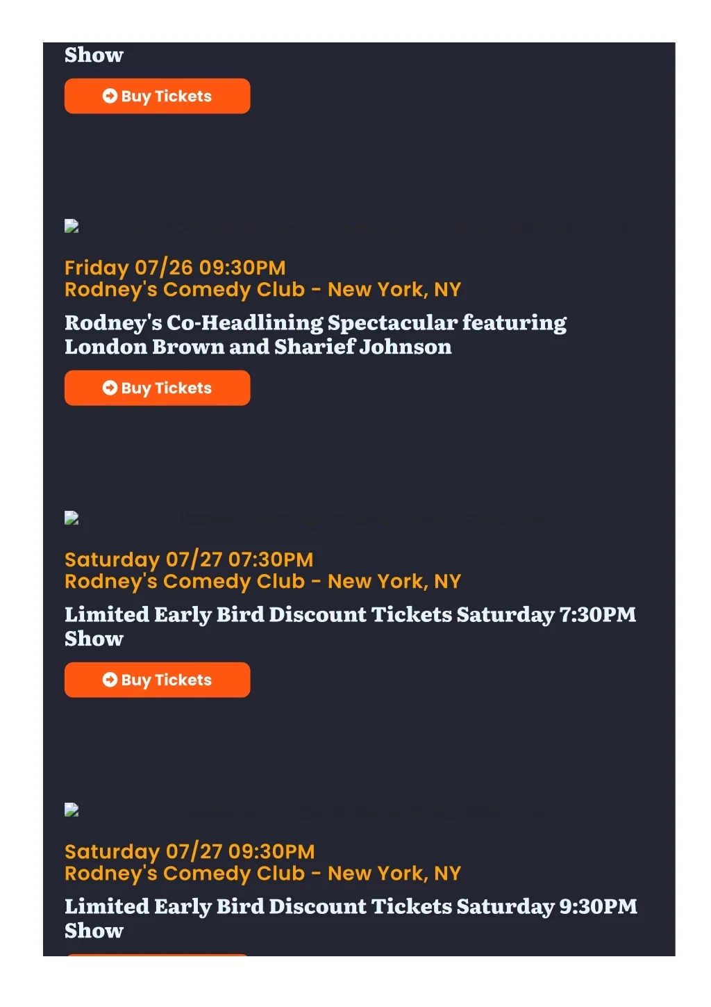 Show Buy Tickets Rodney's Co-Headlining Spectacular featuring London Brown and Sharief Johnson Friday 07/26 09:30PM Rodney's Comedy Club - New York, NY Rodney's Co-Headlining Spectacular featuring London Brown and Sharief Johnson Buy Tickets Limited Early Bird Discount Tickets Saturday 7:30PM Show Saturday 07/27 07:30PM Rodney's Comedy Club - New York, NY Limited Early Bird Discount Tickets Saturday 7:30PM Show Buy Tickets Limited Early Bird Discount Tickets Saturday 9:30PM Show Saturday 07/27 09:30PM Rodney's Comedy Club - New York, NY Limited Early Bird Discount Tickets Saturday 9:30PM Show