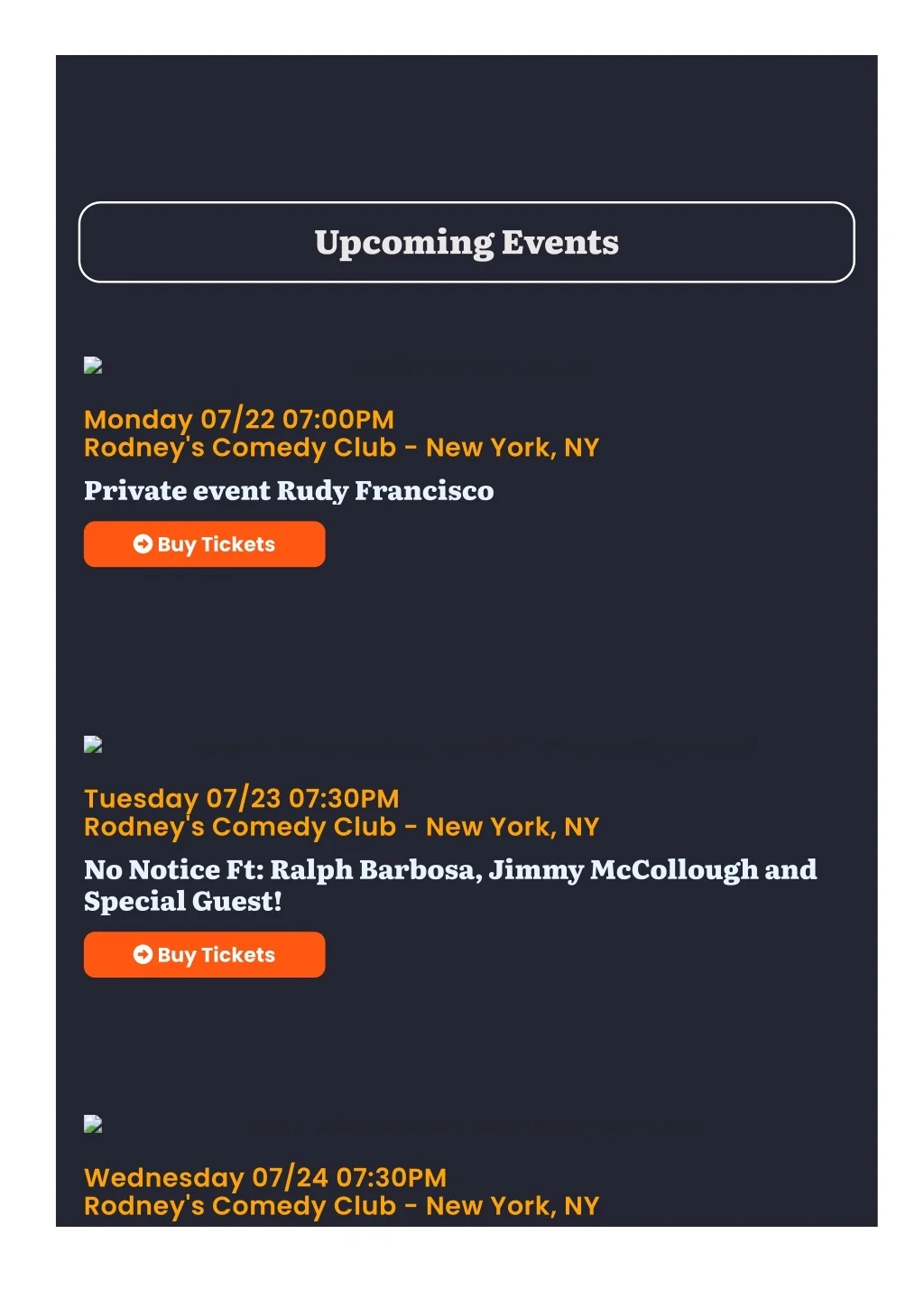 Upcoming Events Private event Rudy Francisco Monday 07/22 07:00PM Rodney's Comedy Club - New York, NY Private event Rudy Francisco Buy Tickets No Notice Ft: Ralph Barbosa, Jimmy McCollough and Special Guest! Tuesday 07/23 07:30PM Rodney's Comedy Club - New York, NY No Notice Ft: Ralph Barbosa, Jimmy McCollough and Special Guest! Buy Tickets Bobby Collins Headlines Rodney's! Wednesday July 24! Wednesday 07/24 07:30PM Rodney's Comedy Club - New York, NY