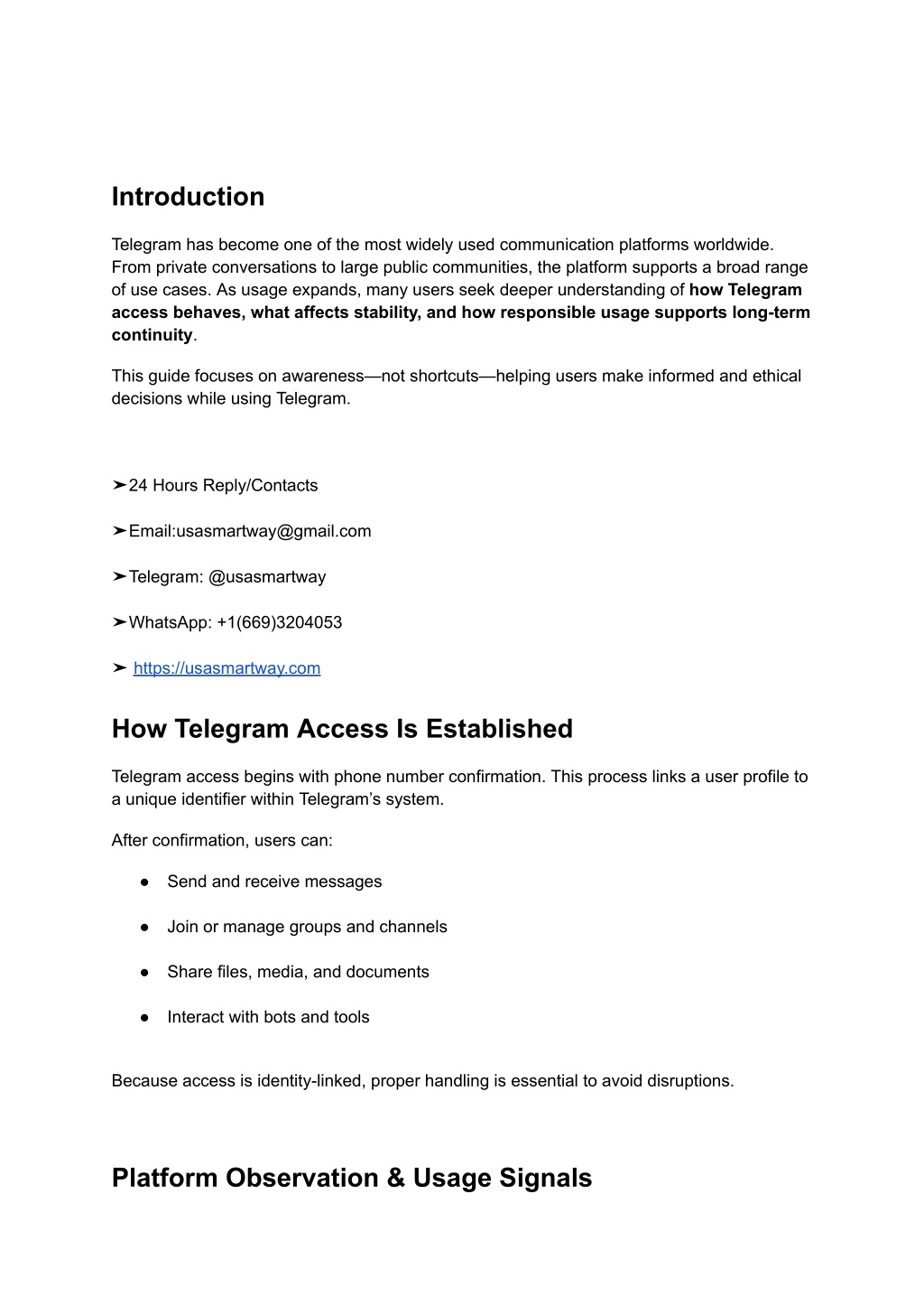 Introduction Telegram has become one of the most widely used communication platforms worldwide. From private conversations to large public communities, the platform supports a broad range of use cases. As usage expands, many users seek deeper understanding of how Telegram access behaves, what affects stability, and how responsible usage supports long-term continuity. This guide focuses on awareness—not shortcuts—helping users make informed and ethical decisions while using Telegram. ➤24 Hours Reply/Contacts ➤Email:usasmartway@gmail.com ➤Telegram: @usasmartway ➤WhatsApp: +1(669)3204053 ➤ https://usasmartway.com How Telegram Access Is Established Telegram access begins with phone number confirmation. This process links a user profile to a unique identifier within Telegram’s system. After confirmation, users can: ● Send and receive messages ● Join or manage groups and channels ● Share files, media, and documents ● Interact with bots and tools Because access is identity-linked, proper handling is essential to avoid disruptions. Platform Observation & Usage Signals