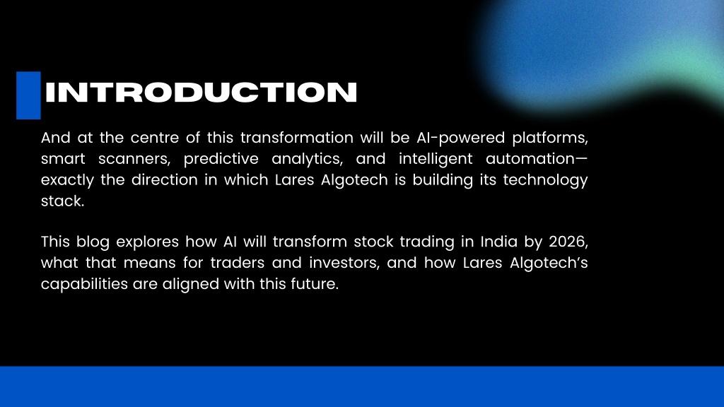 Introduction And at the centre of this transformation will be AI-powered platforms, smart scanners, predictive analytics, and intelligent automation—exactly the direction in which Lares Algotech is building its technology stack. • This blog explores how AI will transform stock trading in India by 2026, what that means for traders and investors, and how Lares Algotech’s capabilities are aligned with this future.