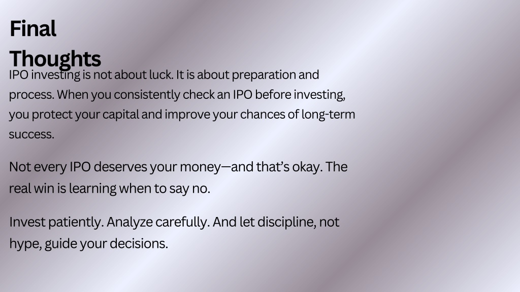 Final Thoughts • IPO investing is not about luck. It is about preparation and process. When you consistently check an IPO before investing, you protect your capital and improve your chances of long-term success. • Not every IPO deserves your money—and that’s okay. The real win is learning when to say no. • Invest patiently. Analyze carefully. And let discipline, not hype, guide your decisions.
