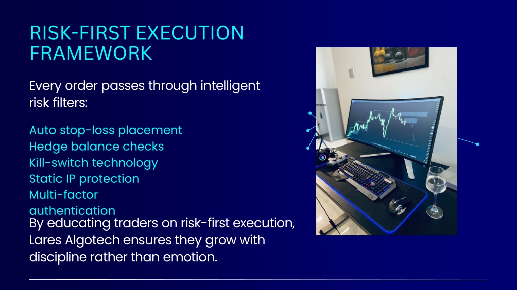 4. RISK-FIRST EXECUTION FRAMEWORK • Every order passes through intelligent risk filters: • Auto stop-loss placement • Hedge balance checks • Kill-switch technology • Static IP protection • Multi-factor authentication • By educating traders on risk-first execution, Lares Algotech ensures theygrow withdiscipline rather than emotion.