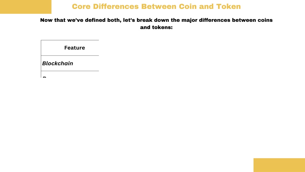 Core Differences Between Coin and Token Now that we’ve defined both, let’s break down the major differences between coins and tokens: