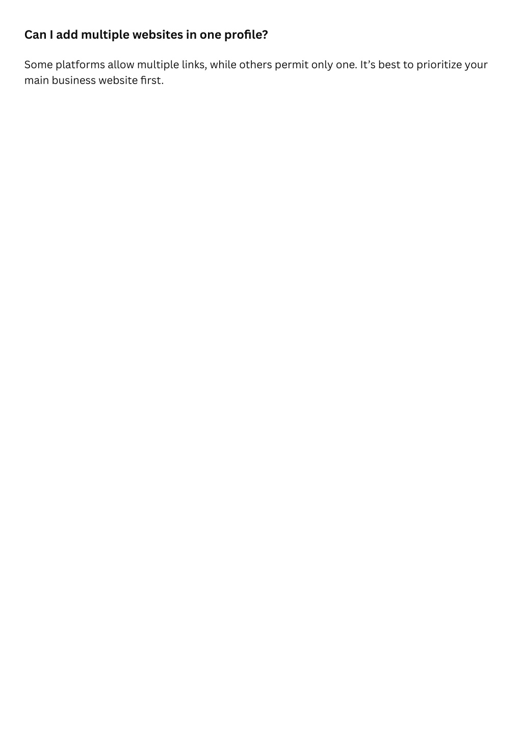 Can I add multiple websites in one profile? Some platforms allow multiple links, while others permit only one. It’s best to prioritize your main business website first.