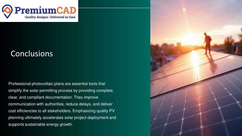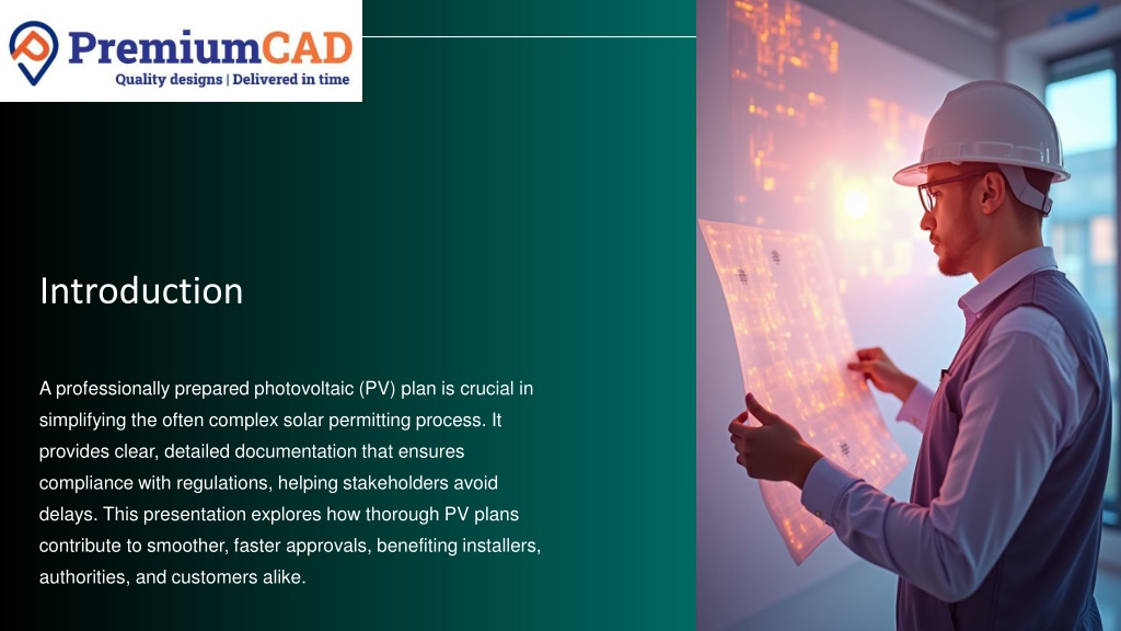 A professionally prepared photovoltaic (PV) plan is crucial in simplifying the often complex solar permitting process. It provides clear, detailed documentation that ensures compliance with regulations, helping stakeholders avoid delays. This presentation explores how thorough PV plans contribute to smoother, faster approvals, benefiting installers, authorities, and customers alike. Introduction