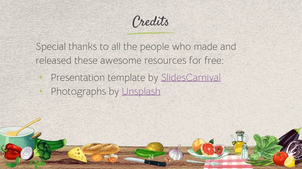 Instructions for use EDIT IN GOOGLE SLIDES Click on the button under the presentation preview that says "Use as Google Slides Theme". You will get a copy of this document on your Google Drive and will be able to edit, add or delete slides. You have to be signed in to your Google account. EDIT IN POWERPOINT® Click on the button under the presentation preview that says "Download as PowerPoint template". You will get a .pptx file that you can edit in PowerPoint. Remember to download and install the fonts used in this presentation (you’ll find the links to the font files needed in the Presentation design slide) More info on how to use this template at slidescarnival.com/help-use-presentation-template This template is free to use under Creative Commons Attribution license. You can keep the Credits slide or mention SlidesCarnival and other resources used in a slide footer.