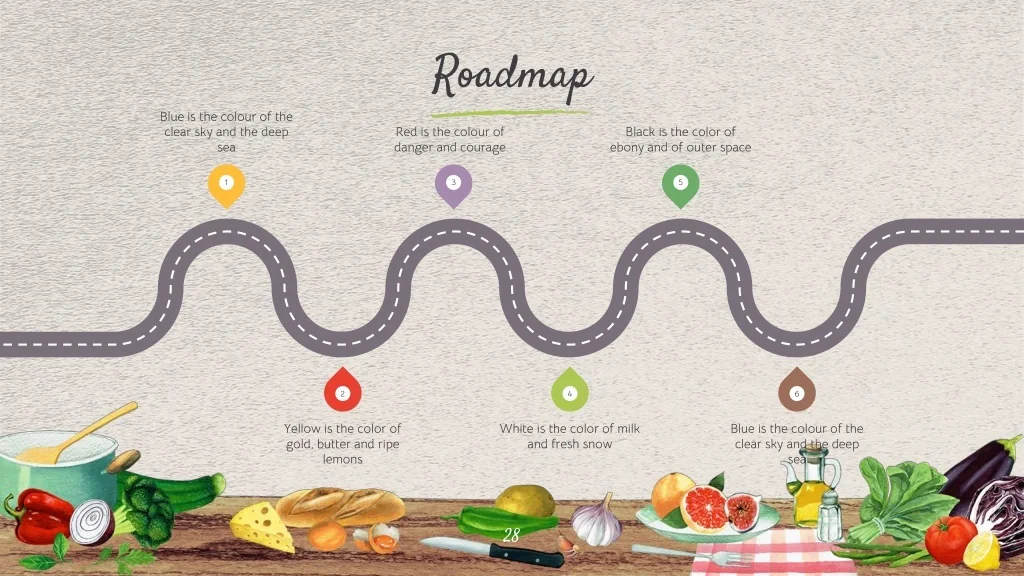 Roadmap Blue is the colour of the clear sky and the deep sea Red is the colour of danger and courage Black is the color of ebony and of outer space 1 3 5 2 4 6 Yellow is the color of gold, butter and ripe lemons White is the color of milk and fresh snow Blue is the colour of the clear sky and the deep sea