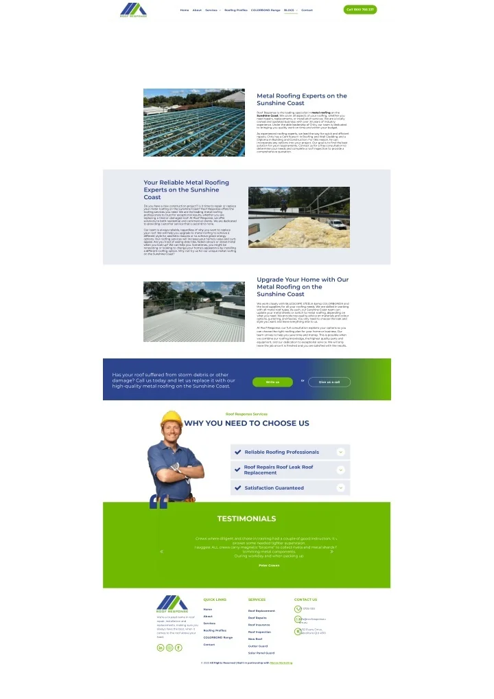 Services BLOGS Call 1800 766 337 Home About Roofing Profiles COLORBOND Range Contact Metal Roo?ng Sunshine Coast Metal Roo?ng Experts on the Sunshine Coast Roof Response is the leading specialist in metal roo?ng on the Sunshine Coast. We cover all aspects of your roo?ng, whether you need repairs, replacements, or installation services. We are a locally owned and operated business with over 20 years of industry experience. Under the able leadership of Chris, our team is dedicated to bringing you quality work on time and within your budget. As experienced roo?ng experts, we lead the way for quick and ef?cient repairs. Chris has a Certi?cate III in Roo?ng and Wall Cladding and a Diploma in Building and Construction. For this reason, he can incorporate any options into your project. Our goal is to ?nd the best solution for your requirements. Contact us for a free consultation to determine your needs and complete a roof inspection to provide a comprehensive quotation. Your Reliable Metal Roo?ng Experts on the Sunshine Coast Do you have a new construction project? Is it time to repair or replace your metal roo?ng on the Sunshine Coast? Roof Response offers the roo?ng services you need. We are the leading metal roo?ng professionals to trust for exceptional results, whether you are replacing a tired or damaged roof. At Roof Response, we offer solutions to both residential and commercial clients. We are dedicated to providing customer service that is second to none. Our team is always reliable, regardless of why you want to replace your roof. We will help you upgrade to metal roo?ng to achieve a different style for aesthetic reasons or to achieve green energy options. Our roo?ng services will increase your home’s value and curb appeal. Are you tired of seeing drab tiles, faded colours or dated metal when you look up? We can help you. Sometimes, you might be renovating or looking to change your home’s appearance by installing a different roo?ng option. Why not try us for our unique metal roo?ng on the Sunshine Coast? Upgrade Your Home with Our Metal Roo?ng on the Sunshine Coast We work closely with BLUESCOPE STEEL® & COLORBOND® and the local suppliers for all your roo?ng needs. We are skilled in working with all metal roof types. As such, our Sunshine Coast team can update your metal sheets or switch to metal roo?ng, depending on what you need. We provide top-quality advice on materials and colour options, guttering, and fascias. You only need to choose the look and style you want and leave everything else to us. At Roof Response, our full consultation explains your options so you can choose the right roo?ng plan for your home or business. Our team strives to help you save time and money. This is possible when we combine our roo?ng knowledge, the highest quality parts and equipment, and our dedication to exceptional service. We will only leave the job once it is ?nished and you are satis?ed with the results. Has your roof suffered from storm debris or other Or damage? Call us today and let us replace it with our Give us a call Write us high-quality metal roo?ng on the Sunshine Coast. Roof Response Services WHY YOU NEED TO CHOOSE US Reliable Roo?ng Professionals Roof Repairs Roof Leak Roof Replacement Satisfaction Guaranteed TESTIMONIALS Crews where diligent and those in training had a couple of good instructors. It w proven some needed tighter supervision. I suggest ALL crews carry magnetic 'brooms" to collect rivets and metal shards f trimming metal components. During workday and when packing up Peter Craven QUICK LINKS SERVICES CONTACT US 07 3709 1351 Home Roof Replacement About info@roofresponse.c We’re a trusted name in roof Roof Repairs repair, installation and om.au Services Roof Insurance replacements, making sure you always have the best, when it i4/52 Evans Drive, Roofing Profiles Roof Inspection comes to the roof above your Caboolture Qld 4510 head. COLORBOND Range New Roof Contact Gutter Guard Solar Panel Guard © 2023 All Rights Reserved | Built in partnership with Mensa Marketing