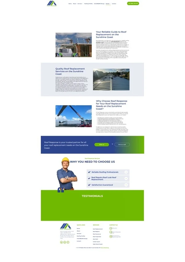Services BLOGS Call 1800 766 337 Home About Roofing Profiles COLORBOND Range Contact Roof Replacement Sunshine Coast Your Reliable Guide to Roof Replacement on the Sunshine Coast Roof Response is your best bet if you are looking for a reliable roo?ng company to help you with your roof replacement needs on the Sunshine Coast. We have been serving Brisbane and the Sunshine Coast for years, providing homeowners with high-quality roo?ng services. We take pride in our workmanship and strive to complete all roo?ng projects to the highest standards. We use only top-quality materials, such as BlueScope Steel and COLORBOND, to ensure your roof is aesthetically pleasing and long-lasting. Our team of experienced roo?ng professionals knows the ins and outs of the roo?ng industry. Our founder, Chris, and his dedicated team have over two decades of experience in the roo?ng industry. With Chris's quali?cations, including a Certi?cate III in Roo?ng and Wall Cladding and a Diploma in Building and Construction, we bring expertise and professionalism to every project we undertake. When you choose Roof Response for your roof replacement needs, you can rest assured you are working with a reputable, trustworthy, and reliable roo?ng company. Quality Roof Replacement Services on the Sunshine Coast Replacing your roof is about more than just functionality. It's an opportunity to transform your home's look and feel. Roof Response is your go-to company whether you need to replace your roof due to damage, wear and tear, or to improve your home's appearance. We provide fast, ef?cient, and affordable roof replacement services from the Gold Coast to the Sunshine Coast. Our team is skilled in working with all types of metal roo?ng materials. We guarantee to install your new roof safely, securely, and with the highest level of professionalism. We keep you informed throughout the project, from initial consultation to ?nal inspection. Our roofers will also complete your project on time and within budget. We aim to make your roof replacement project smooth and stress-free. We offer a free consultation to discuss your needs and determine the best solution for your roof replacement project. Why Choose Roof Response for Your Roof Replacement Needs on the Sunshine Coast? At Roof Response, we are committed to providing the best possible roof replacement services on the Sunshine Coast. When you choose Roof Response for your roof replacement needs, you can expect: • Professionally trained, licensed, and insured experts. • Personalised attention and excellent customer service. • Superior craftsmanship and attention to detail. • Guaranteed satisfaction with every job we perform. • Competitive pricing and a range of ?nancing options. • Fast, ef?cient, and reliable service from start to ?nish. • Use the highest quality materials for all our roo?ng projects. In addition to our exceptional customer service and top-quality workmanship, we also offer a range of roo?ng options to suit any budget or style preference. From traditional shingle and metal roofs to more modern and energy-ef?cient options, we have the expertise and experience to help you ?nd the perfect solution for your home. Roof Response is your trusted partner for all Or Give us a call Write us your roof replacement needs on the Sunshine Coast. Roof Response Services WHY YOU NEED TO CHOOSE US Reliable Roo?ng Professionals Roof Repairs Roof Leak Roof Replacement Satisfaction Guaranteed TESTIMONIALS QUICK LINKS SERVICES CONTACT US 07 3709 1351 Home Roof Replacement About info@roofresponse.c We’re a trusted name in roof Roof Repairs repair, installation and om.au Services Roof Insurance replacements, making sure you always have the best, when it i4/52 Evans Drive, Roofing Profiles Roof Inspection comes to the roof above your Caboolture Qld 4510 head. COLORBOND Range New Roof Contact Gutter Guard Solar Panel Guard © 2023 All Rights Reserved | Built in partnership with Mensa Marketing