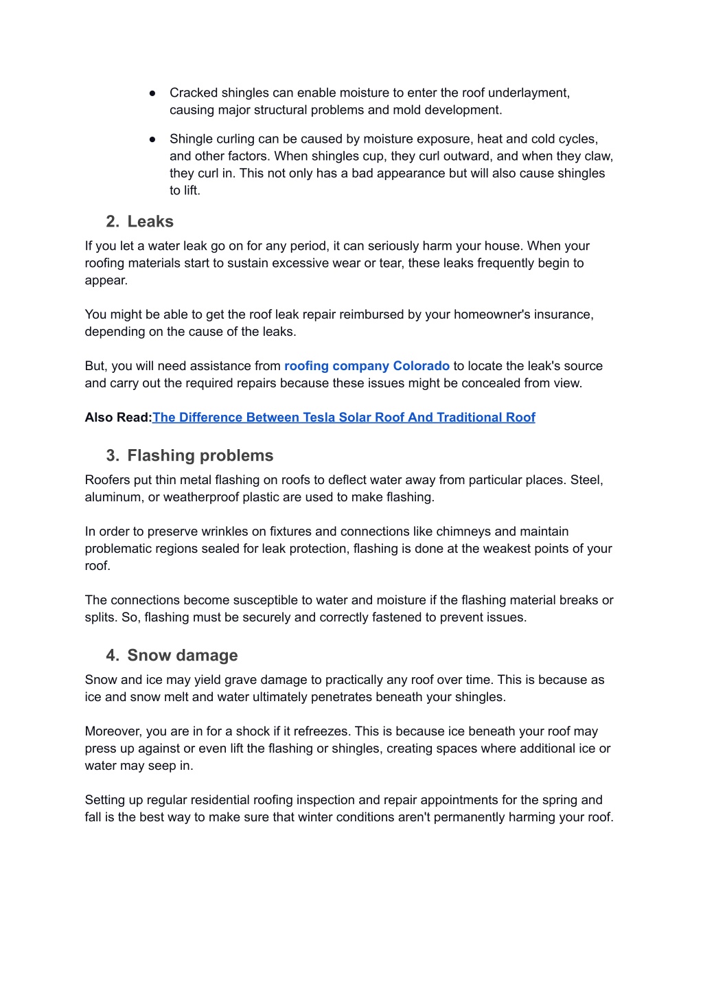 ● Cracked shingles can enable moisture to enter the roof underlayment, causing major structural problems and mold development. ● Shingle curling can be caused by moisture exposure, heat and cold cycles, and other factors. When shingles cup, they curl outward, and when they claw, they curl in. This not only has a bad appearance but will also cause shingles to lift. 2. Leaks If you let a water leak go on for any period, it can seriously harm your house. When your roofing materials start to sustain excessive wear or tear, these leaks frequently begin to appear. You might be able to get the roof leak repair reimbursed by your homeowner's insurance, depending on the cause of the leaks. But, you will need assistance from roofing company Colorado to locate the leak's source and carry out the required repairs because these issues might be concealed from view. Also Read:The Difference Between Tesla Solar Roof And Traditional Roof 3. Flashing problems Roofers put thin metal flashing on roofs to deflect water away from particular places. Steel, aluminum, or weatherproof plastic are used to make flashing. In order to preserve wrinkles on fixtures and connections like chimneys and maintain problematic regions sealed for leak protection, flashing is done at the weakest points of your roof. The connections become susceptible to water and moisture if the flashing material breaks or splits. So, flashing must be securely and correctly fastened to prevent issues. 4. Snow damage Snow and ice may yield grave damage to practically any roof over time. This is because as ice and snow melt and water ultimately penetrates beneath your shingles. Moreover, you are in for a shock if it refreezes. This is because ice beneath your roof may press up against or even lift the flashing or shingles, creating spaces where additional ice or water may seep in. Setting up regular residential roofing inspection and repair appointments for the spring and fall is the best way to make sure that winter conditions aren't permanently harming your roof.