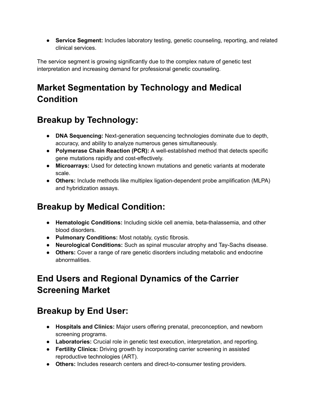 ● Service Segment: Includes laboratory testing, genetic counseling, reporting, and related clinical services. The service segment is growing significantly due to the complex nature of genetic test interpretation and increasing demand for professional genetic counseling. Market Segmentation by Technology and Medical Condition Breakup by Technology: ● DNA Sequencing: Next-generation sequencing technologies dominate due to depth, accuracy, and ability to analyze numerous genes simultaneously. ● Polymerase Chain Reaction (PCR): A well-established method that detects specific gene mutations rapidly and cost-effectively. ● Microarrays: Used for detecting known mutations and genetic variants at moderate scale. ● Others: Include methods like multiplex ligation-dependent probe amplification (MLPA) and hybridization assays. Breakup by Medical Condition: ● Hematologic Conditions: Including sickle cell anemia, beta-thalassemia, and other blood disorders. ● Pulmonary Conditions: Most notably, cystic fibrosis. ● Neurological Conditions: Such as spinal muscular atrophy and Tay-Sachs disease. ● Others: Cover a range of rare genetic disorders including metabolic and endocrine abnormalities. End Users and Regional Dynamics of the Carrier Screening Market Breakup by End User: ● Hospitals and Clinics: Major users offering prenatal, preconception, and newborn screening programs. ● Laboratories: Crucial role in genetic test execution, interpretation, and reporting. ● Fertility Clinics: Driving growth by incorporating carrier screening in assisted reproductive technologies (ART). ● Others: Includes research centers and direct-to-consumer testing providers.