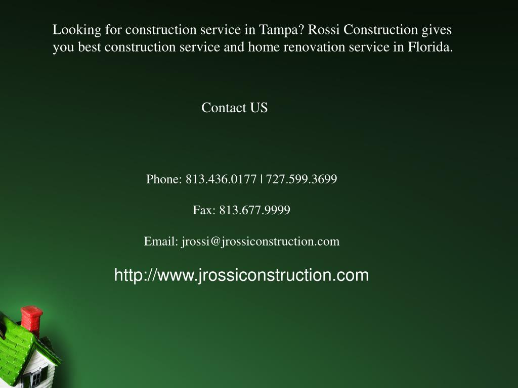 Looking for construction service in Tampa? Rossi Construction gives you best construction service and home renovation service in Florida. Contact US Phone: 813.436.0177 | 727.599.3699 Fax: 813.677.9999 Email: jrossi@jrossiconstruction.com http://www.jrossiconstruction.com