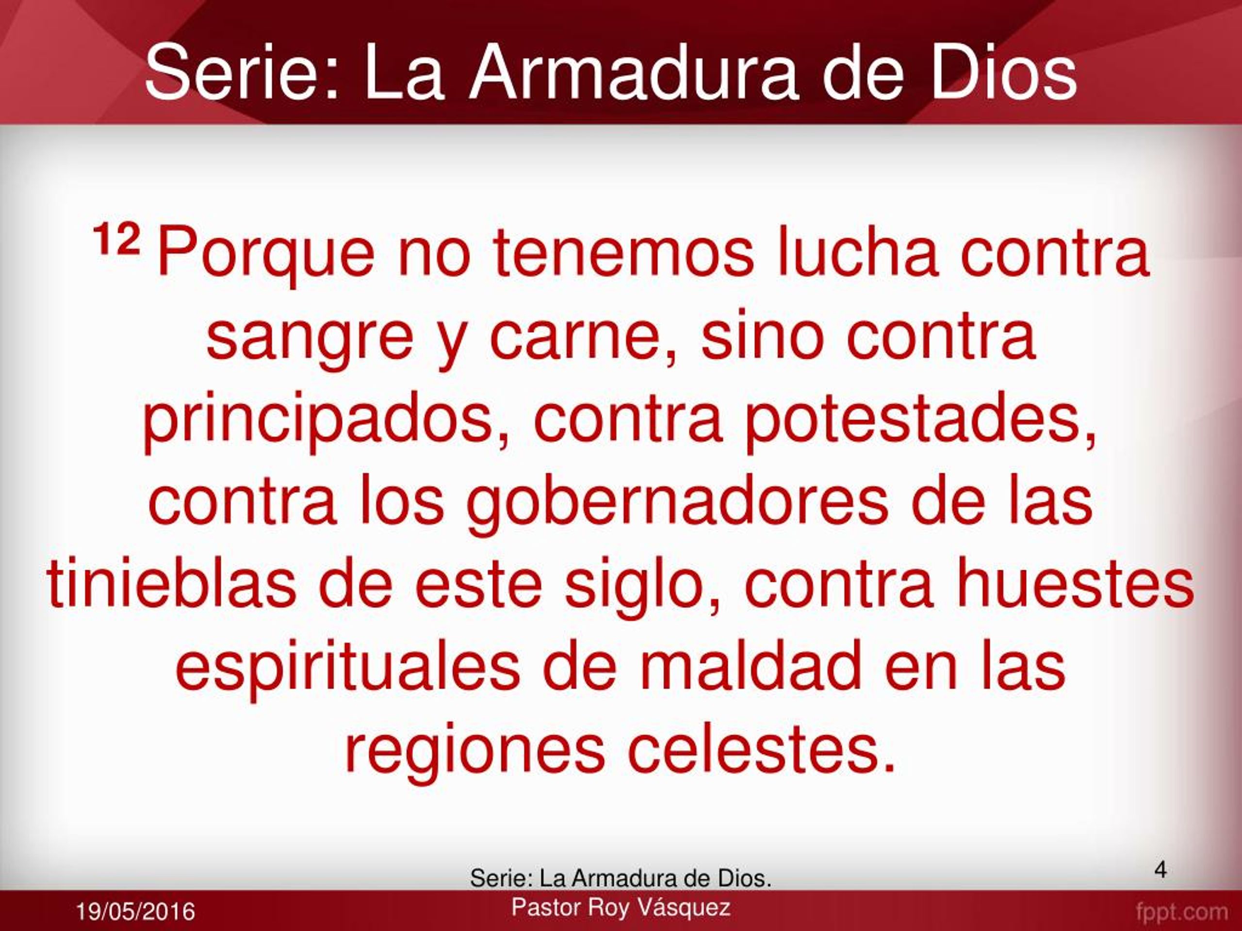 Serie: La Armadura de Dios 12Porque no tenemos lucha contra sangre y carne, sino contra principados, contra potestades, contra los gobernadores de las tinieblas de este siglo, contra huestes espirituales de maldad en las regiones celestes. Serie: La Armadura de Dios. Pastor Roy Vásquez