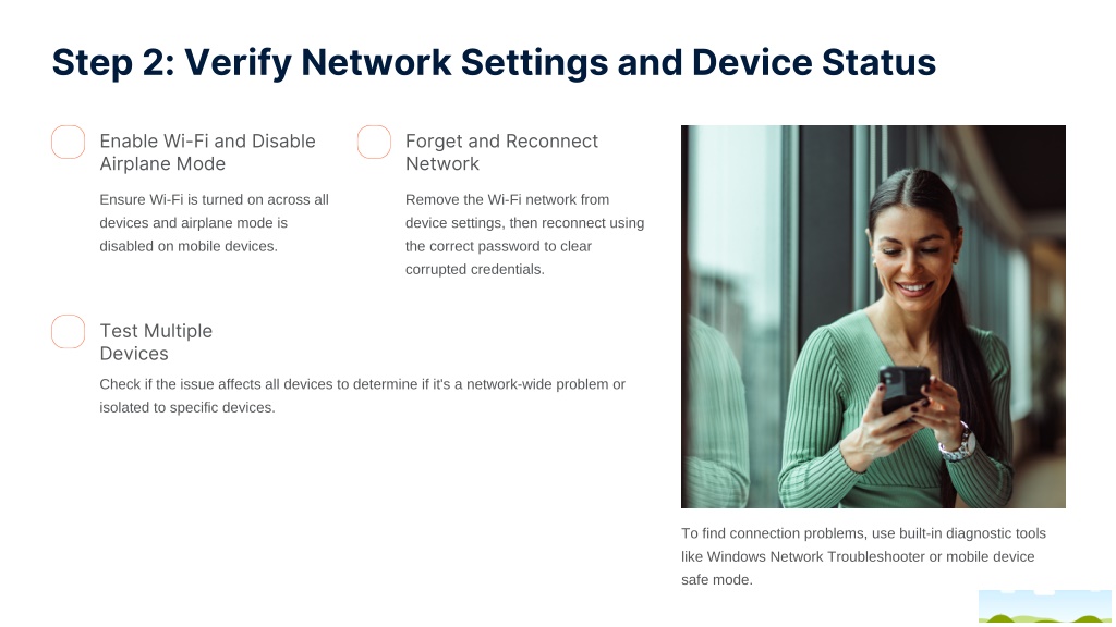 Step 2: Verify Network Settings and Device Status Enable Wi-Fi and Disable Airplane Mode Forget and Reconnect Network Ensure Wi-Fi is turned on across all devices and airplane mode is disabled on mobile devices. Remove the Wi-Fi network from device settings, then reconnect using the correct password to clear corrupted credentials. Test Multiple Devices Check if the issue affects all devices to determine if it's a network-wide problem or isolated to specific devices. To find connection problems, use built-in diagnostic tools like Windows Network Troubleshooter or mobile device safe mode.