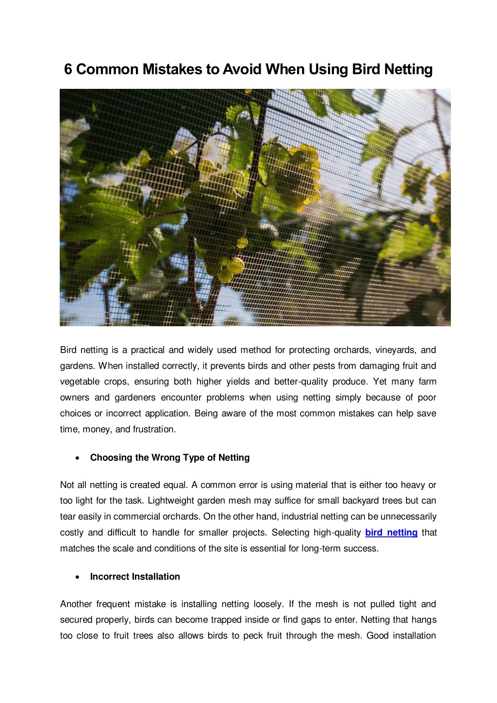 6 Common Mistakes to Avoid When Using Bird Netting Bird netting is a practical and widely used method for protecting orchards, vineyards, and gardens. When installed correctly, it prevents birds and other pests from damaging fruit and vegetable crops, ensuring both higher yields and better-quality produce. Yet many farm owners and gardeners encounter problems when using netting simply because of poor choices or incorrect application. Being aware of the most common mistakes can help save time, money, and frustration. •Choosing the Wrong Type of Netting Not all netting is created equal. A common error is using material that is either too heavy or too light for the task. Lightweight garden mesh may suffice for small backyard trees but can tear easily in commercial orchards. On the other hand, industrial netting can be unnecessarily costly and difficult to handle for smaller projects. Selecting high-quality bird netting that matches the scale and conditions of the site is essential for long-term success. •Incorrect Installation Another frequent mistake is installing netting loosely. If the mesh is not pulled tight and secured properly, birds can become trapped inside or find gaps to enter. Netting that hangs too close to fruit trees also allows birds to peck fruit through the mesh. Good installation