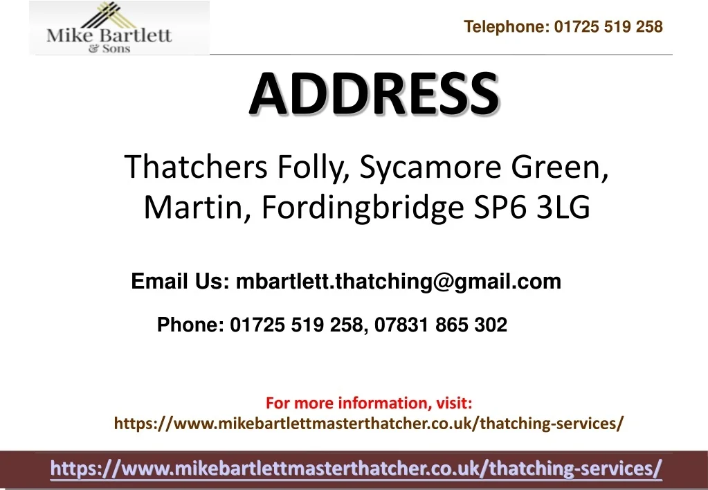 ADDRESS Thatchers Folly, Sycamore Green, Martin, Fordingbridge SP6 3LG Email Us: mbartlett.thatching@gmail.com Phone: 01725 519 258, 07831 865 302 For more information, visit: https://www.mikebartlettmasterthatcher.co.uk/thatching-services/