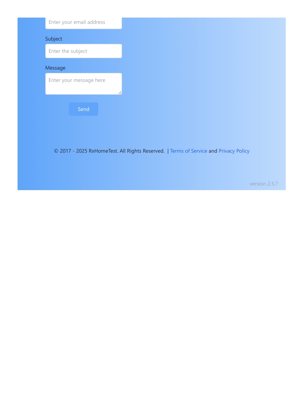 Enter your email address Subject Enter the subject Message Enter your message here Send © 2017 - 2025 RxHomeTest. All Rights Reserved. | Terms of Service and Privacy Policy version 2.5.7