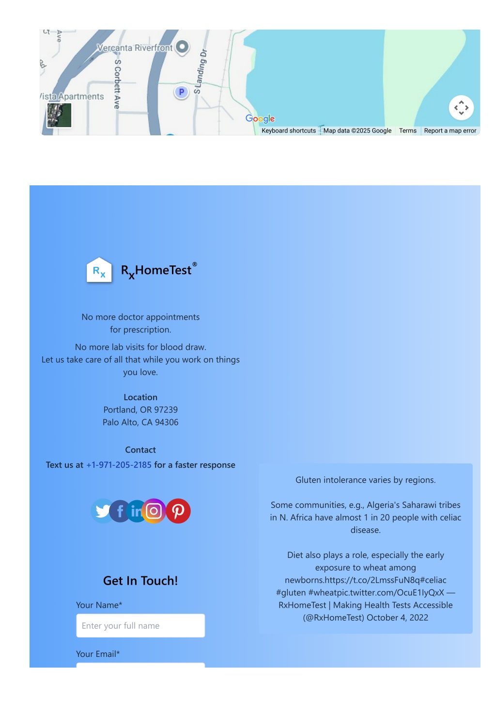 Keyboard shortcuts Map data ©2025 Google Terms Report a map error ® RxHomeTest No more doctor appointments for prescription. No more lab visits for blood draw. Let us take care of all that while you work on things you love. Location Portland, OR 97239 Palo Alto, CA 94306 Contact Text us at +1-971-205-2185 for a faster response Gluten intolerance varies by regions. Some communities, e.g., Algeria's Saharawi tribes in N. Africa have almost 1 in 20 people with celiac disease. Diet also plays a role, especially the early exposure to wheat among newborns.https://t.co/2LmssFuN8q#celiac #gluten #wheatpic.twitter.com/OcuE1IyQxX — RxHomeTest | Making Health Tests Accessible (@RxHomeTest) October 4, 2022 Get In Touch! Your Name* Enter your full name Your Email*
