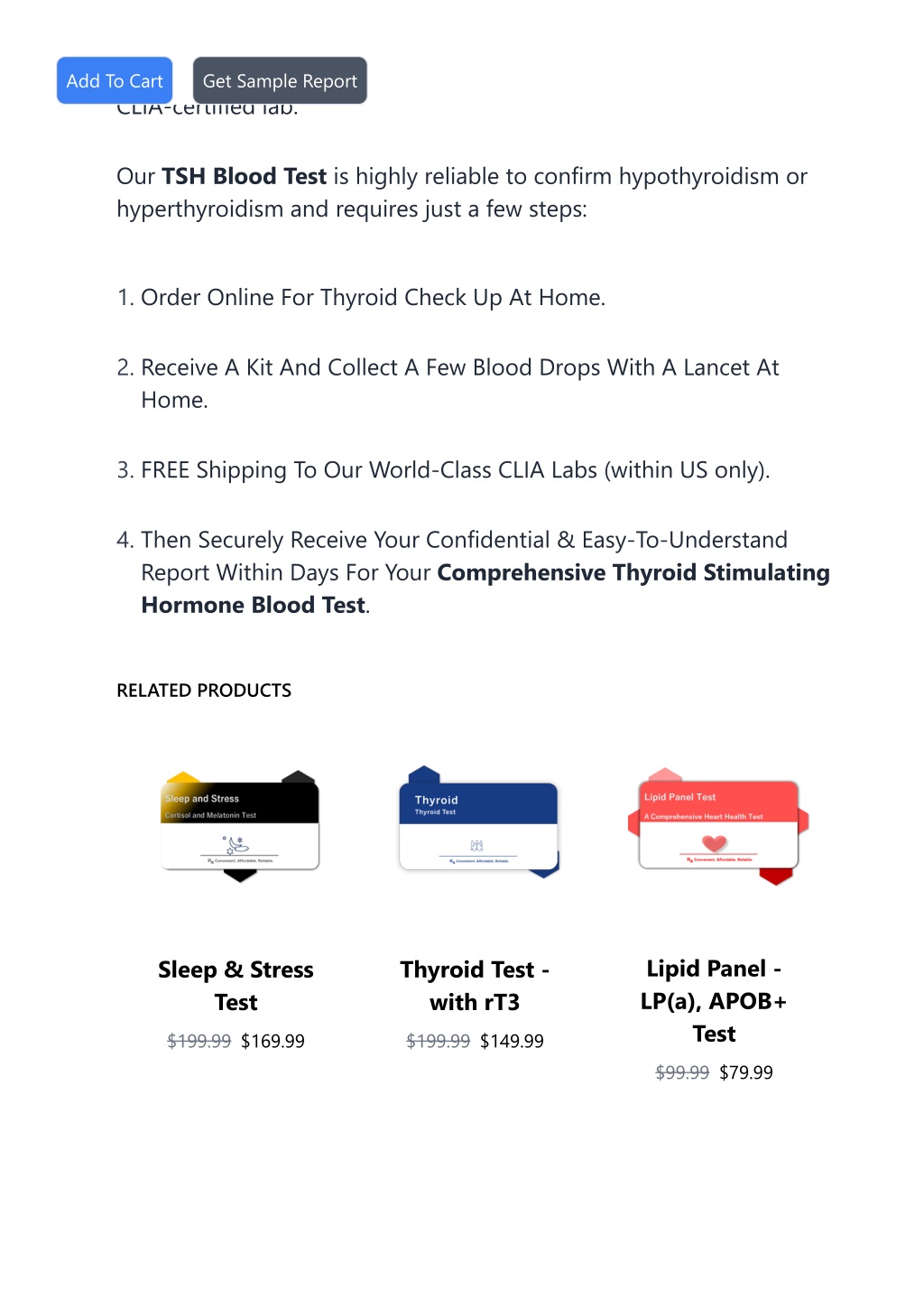 levels, with a finger prick sample collected at home and mailed to a CLIA-certified lab. Add To Cart Get Sample Report Our TSH Blood Test is highly reliable to confirm hypothyroidism or hyperthyroidism and requires just a few steps: 1. Order Online For Thyroid Check Up At Home. 2. Receive A Kit And Collect A Few Blood Drops With A Lancet At Home. 3. FREE Shipping To Our World-Class CLIA Labs (within US only). 4. Then Securely Receive Your Confidential & Easy-To-Understand Report Within Days For Your Comprehensive Thyroid Stimulating Hormone Blood Test. RELATED PRODUCTS Lipid Panel - LP(a), APOB+ Test Sleep & Stress Test Thyroid Test - with rT3 $199.99 $169.99 $199.99 $149.99 $99.99 $79.99