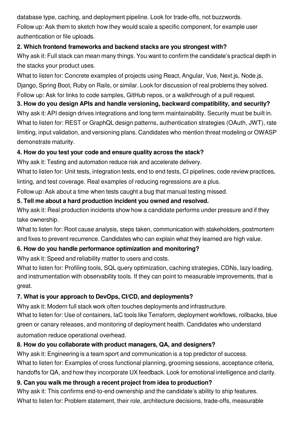2. databasetype,caching,anddeploymentpipeline.Lookfortrade-offs,notbuzzwords. Followup:Askthemtosketchhowtheywouldscaleaspecificcomponent,forexampleuser authenticationorfileuploads. Whichfrontendframeworksandbackend stacksareyoustrongestwith? Whyaskit:Fullstackcanmeanmanythings.Youwanttoconfirmthecandidate’spracticaldepthin thestacksyourproductuses. Whattolistenfor:ConcreteexamplesofprojectsusingReact,Angular,Vue,Next.js,Node.js, Django,SpringBoot,RubyonRails,orsimilar.Lookfordiscussionofrealproblemstheysolved. Followup:Askforlinkstocodesamples,GitHubrepos,orawalkthrough ofapullrequest. HowdoyoudesignAPIsandhandleversioning,backwardcompatibility,andsecurity? Whyaskit:APIdesigndrivesintegrationsandlongtermmaintainability.Securitymustbebuiltin. Whattolistenfor:RESTorGraphQLdesignpatterns,authenticationstrategies(OAuth,JWT),rate limiting,inputvalidation,andversioningplans.CandidateswhomentionthreatmodelingorOWASP demonstratematurity. Howdoyoutestyourcodeandensurequalityacrossthestack? Whyaskit:Testingandautomationreduceriskandacceleratedelivery. Whattolistenfor:Unittests,integrationtests,endtoendtests,CIpipelines,codereviewpractices, linting,andtestcoverage.Realexamplesofreducingregressionsareaplus. Followup:Askaboutatimewhentestscaughtabugthatmanualtestingmissed. Tellmeaboutahardproductionincidentyouownedandresolved. Whyaskit:Realproductionincidentsshowhowacandidateperformsunderpressureandifthey takeownership. Whattolistenfor:Rootcauseanalysis,stepstaken,communicationwithstakeholders,postmortem andfixestopreventrecurrence.Candidateswhocanexplainwhattheylearnedarehighvalue. Howdoyouhandleperformanceoptimizationandmonitoring? Whyaskit:Speedandreliabilitymattertousersandcosts. Whattolistenfor:Profilingtools,SQLqueryoptimization,cachingstrategies,CDNs,lazyloading, andinstrumentationwithobservabilitytools.Iftheycanpointtomeasurableimprovements,thatis great. WhatisyourapproachtoDevOps,CI/CD,anddeployments? Whyaskit:Modernfullstackworkoftentouchesdeploymentsandinfrastructure. Whattolistenfor:Useofcontainers,IaCtoolslikeTerraform,deploymentworkflows,rollbacks,blue greenorcanaryreleases,andmonitoringofdeploymenthealth.Candidateswhounderstand automationreduceoperationaloverhead. Howdoyoucollaboratewithproductmanagers,QA,anddesigners? Whyaskit:Engineeringisateamsportandcommunicationisatoppredictorofsuccess. Whattolistenfor:Examplesofcrossfunctionalplanning,groomingsessions,acceptancecriteria, handoffsforQA,andhowtheyincorporateUXfeedback.Lookforemotionalintelligenceandclarity. Canyouwalkmethrougharecentprojectfromideatoproduction? Whyaskit:Thisconfirmsend-to-endownershipandthecandidate’sabilitytoshipfeatures. Whattolistenfor:Problemstatement,theirrole,architecturedecisions,trade-offs,measurable