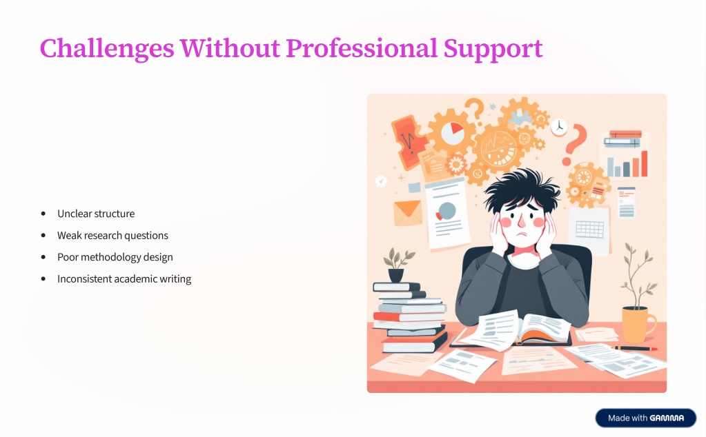 4. Challenges Without Professional Support Unclear structure Weak research questions Poor methodology design Inconsistent academic writing