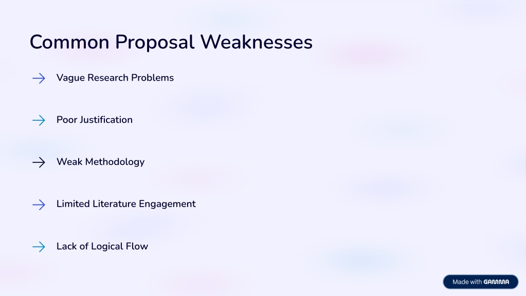 4. Common Proposal Weaknesses Vague Research Problems Poor Justification Weak Methodology Limited Literature Engagement Lack of Logical Flow