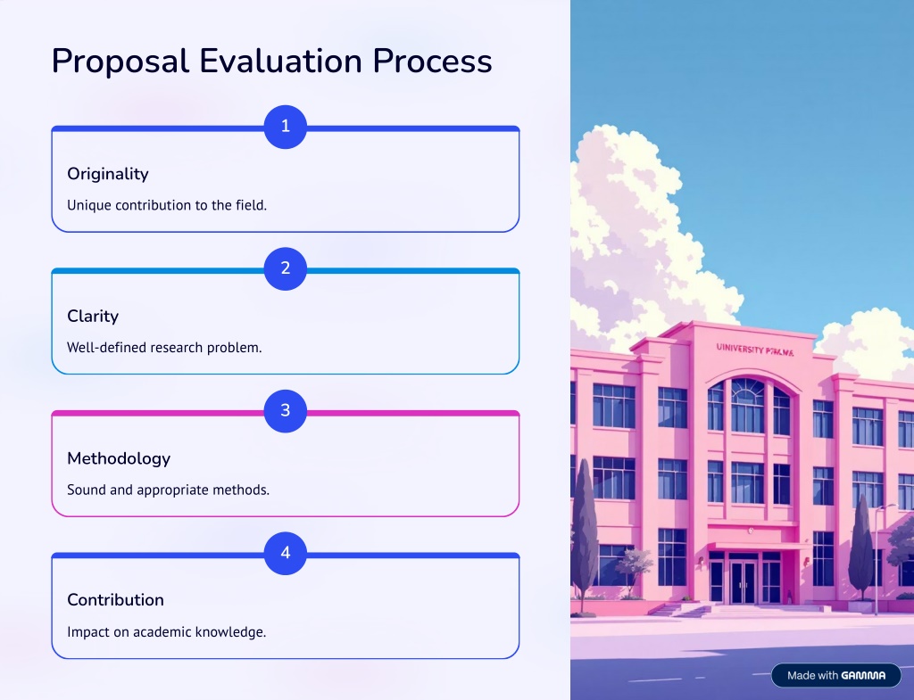 3. Proposal Evaluation Process 1 Originality Unique contribution to the field. 2 Clarity Well-defined research problem. 3 Methodology Sound and appropriate methods. 4 Contribution Impact on academic knowledge.