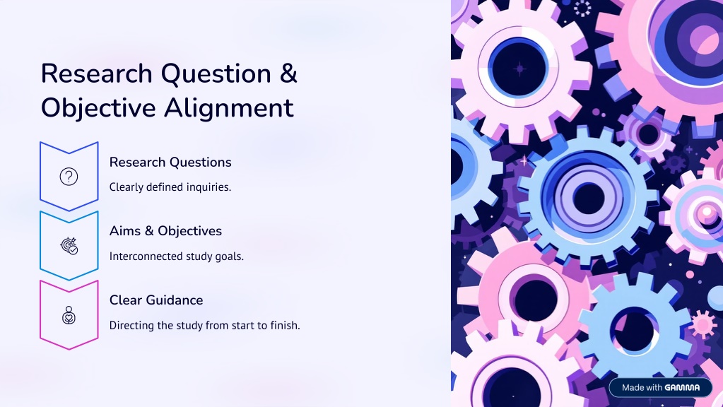 6. Research Question & Objective Alignment Research Questions Clearly defined inquiries. Aims & Objectives Interconnected study goals. Clear Guidance Directing the study from start to finish.