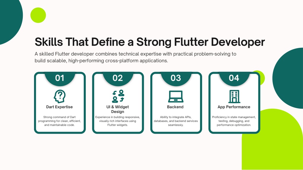 Skills That Define a Strong Flutter Developer A skilled Flutter developer combines technical expertise with practical problem-solving to build scalable, high-performing cross-platform applications. 01 02 03 04 Dart Expertise UI & Widget Design Backend App Performance Strong command of Dart programming for clean, efficient, and maintainable code. Experience in building responsive, visually rich interfaces using Flutter widgets. Ability to integrate APIs, databases, and backend services seamlessly. Proficiency in state management, testing, debugging, and performance optimization.