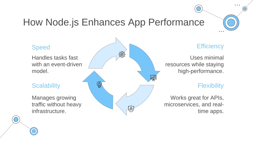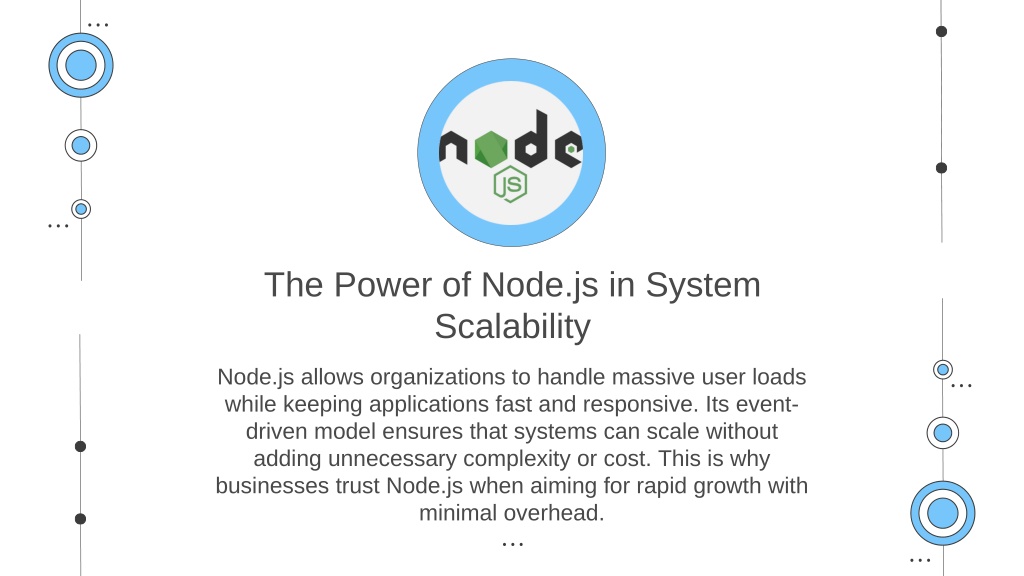 5. The Power of Node.js in System Scalability Node.js allows organizations to handle massive user loads while keeping applications fast and responsive. Its event- driven model ensures that systems can scale without adding unnecessary complexity or cost. This is why businesses trust Node.js when aiming for rapid growth with minimal overhead.