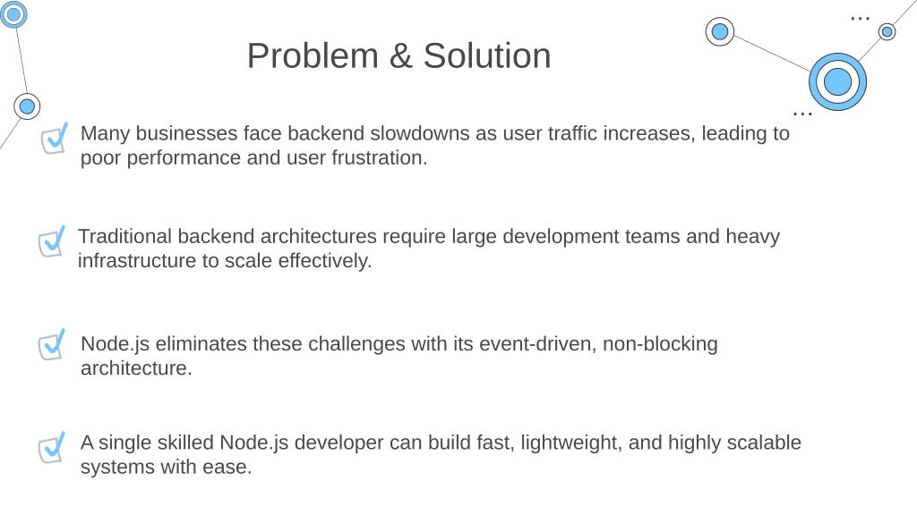 2. Problem & Solution Many businesses face backend slowdowns as user traffic increases, leading to poor performance and user frustration. Traditional backend architectures require large development teams and heavy infrastructure to scale effectively. Node.js eliminates these challenges with its event-driven, non-blocking architecture. A single skilled Node.js developer can build fast, lightweight, and highly scalable systems with ease.