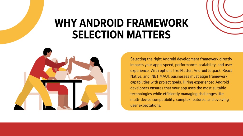 3. WHY ANDROID FRAMEWORK SELECTION MATTERS Selecting the right Android development framework directly impacts your app’s speed, performance, scalability, and user experience. With options like Flutter, Android Jetpack, React Native, and .NET MAUI, businesses must align framework capabilities with project goals. Hiring experienced Android developers ensures that your app uses the most suitable technologies while efficiently managing challenges like multi-device compatibility, complex features, and evolving user expectations.