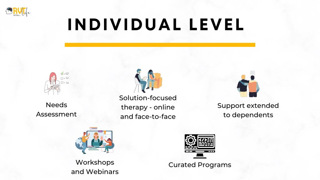 INDIVIDUAL LEVEL Solution-focused therapy - online and face-to-face Needs Assessment Support extended to dependents Workshops and Webinars Curated Programs