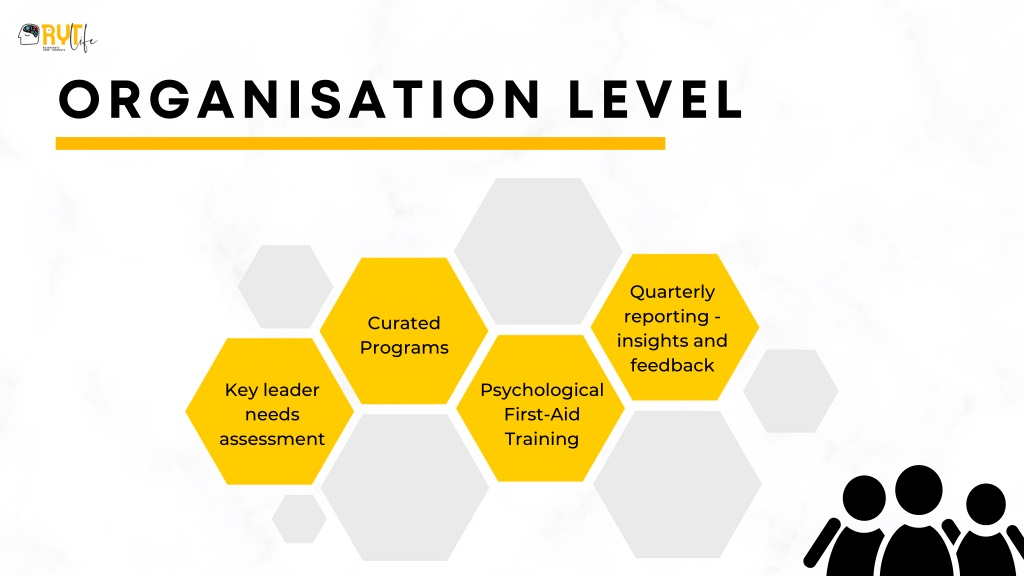 ORGANISATION LEVEL Quarterly reporting - insights and feedback Curated Programs Key leader needs assessment Psychological First-Aid Training