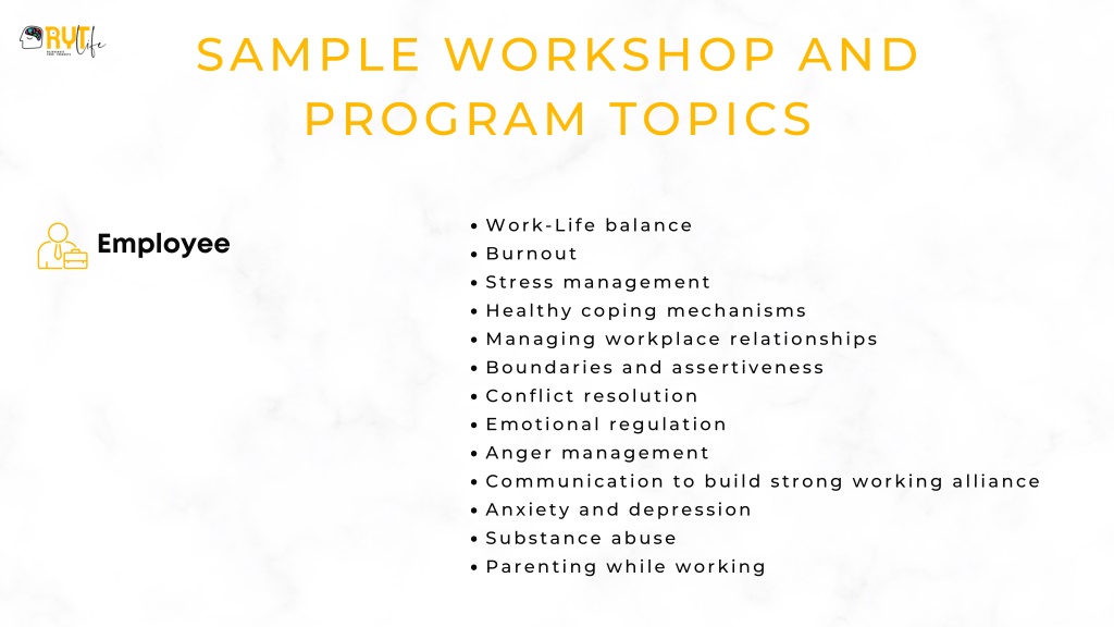 SAMPLE WORKSHOP AND PROGRAM TOPICS Work-Life balance Burnout Stress management Healthy coping mechanisms Managing workplace relationships Boundaries and assertiveness Conflict resolution Emotional regulation Anger management Communication to build strong working alliance Anxiety and depression Substance abuse Parenting while working Employee