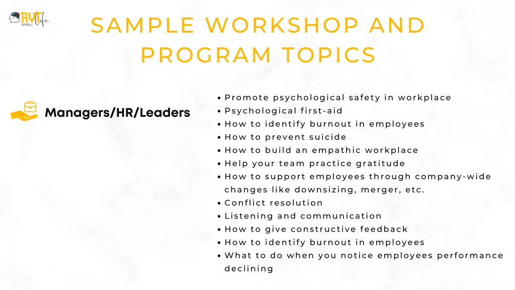 SAMPLE WORKSHOP AND PROGRAM TOPICS Promote psychological safety in workplace Psychological first-aid How to identify burnout in employees How to prevent suicide How to build an empathic workplace Help your team practice gratitude How to support employees through company-wide changes like downsizing, merger, etc. Conflict resolution Listening and communication How to give constructive feedback How to identify burnout in employees What to do when you notice employees performance declining Managers/HR/Leaders