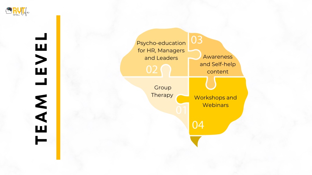 TEAM LEVEL Psycho-education for HR, Managers and Leaders Awareness and Self-help content Group Therapy Workshops and Webinars