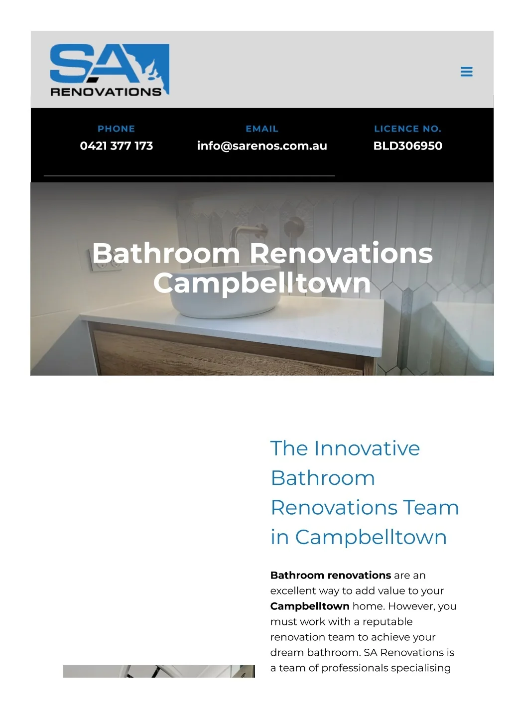 PHONE EMAIL LICENCE NO. 0421 377 173 info@sarenos.com.au BLD306950 Bathroom Renovations Campbelltown The Innovative Bathroom Renovations Team in Campbelltown Bathroom renovations are an excellent way to add value to your Campbelltown home. However, you must work with a reputable renovation team to achieve your dream bathroom. SA Renovations is a team of professionals specialising