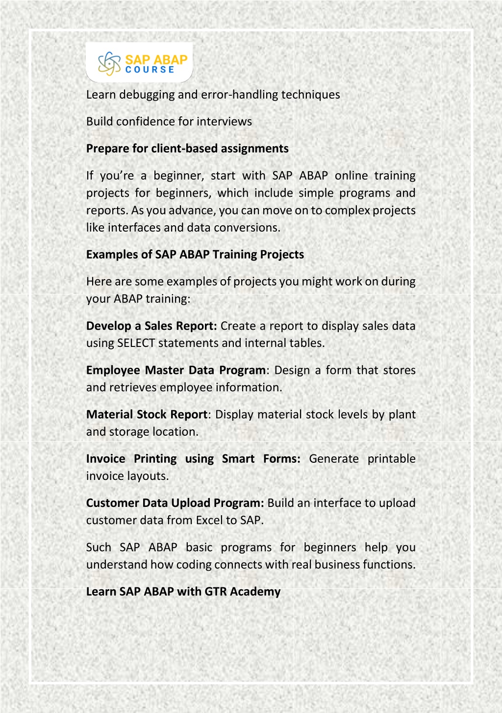 Learn debugging and error-handling techniques Build confidence for interviews Prepare for client-based assignments If you’re a beginner, start with SAP ABAP online training projects for beginners, which include simple programs and reports. As you advance, you can move on to complex projects like interfaces and data conversions. Examples of SAP ABAP Training Projects Here are some examples of projects you might work on during your ABAP training: Develop a Sales Report: Create a report to display sales data using SELECT statements and internal tables. Employee Master Data Program: Design a form that stores and retrieves employee information. Material Stock Report: Display material stock levels by plant and storage location. Invoice Printing using Smart Forms: Generate printable invoice layouts. Customer Data Upload Program: Build an interface to upload customer data from Excel to SAP. Such SAP ABAP basic programs for beginners help you understand how coding connects with real business functions. Learn SAP ABAP with GTR Academy