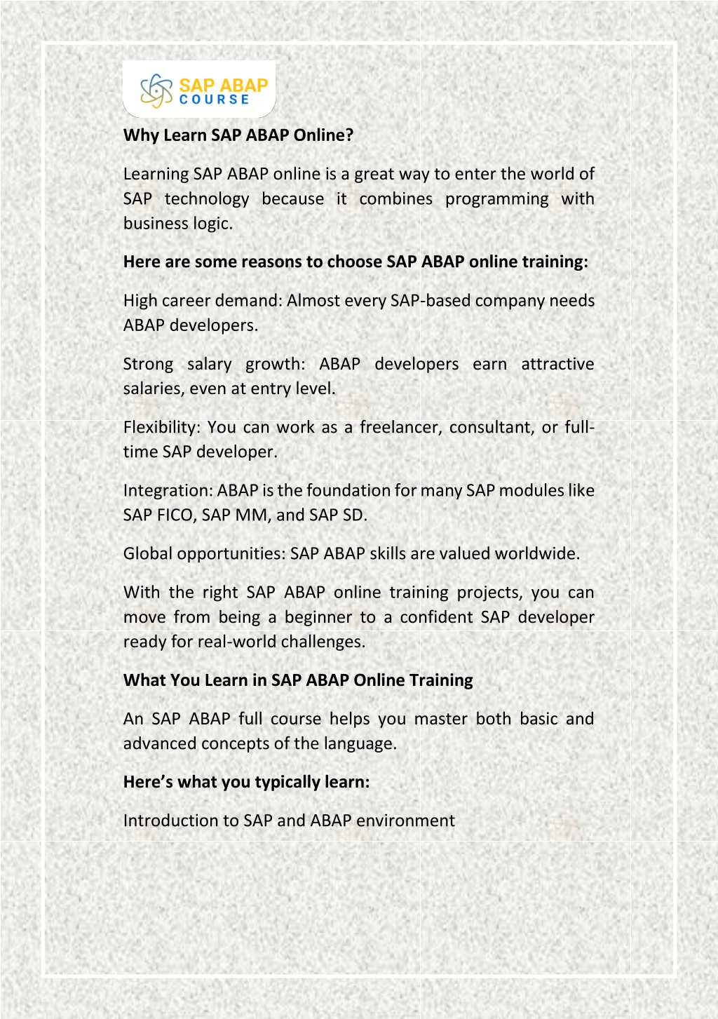 Why Learn SAP ABAP Online? Learning SAP ABAP online is a great way to enter the world of SAP technology because it combines programming with business logic. Here are some reasons to choose SAP ABAP online training: High career demand: Almost every SAP-based company needs ABAP developers. Strong salary growth: ABAP developers earn attractive salaries, even at entry level. Flexibility: You can work as a freelancer, consultant, or full- time SAP developer. Integration: ABAP is the foundation for many SAP modules like SAP FICO, SAP MM, and SAP SD. Global opportunities: SAP ABAP skills are valued worldwide. With the right SAP ABAP online training projects, you can move from being a beginner to a confident SAP developer ready for real-world challenges. What You Learn in SAP ABAP Online Training An SAP ABAP full course helps you master both basic and advanced concepts of the language. Here’s what you typically learn: Introduction to SAP and ABAP environment
