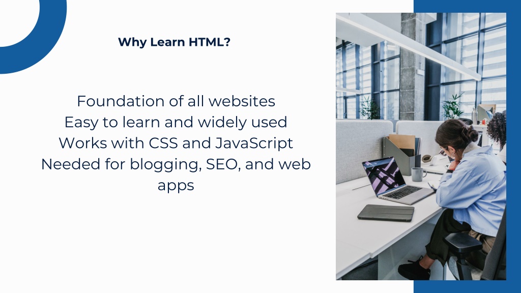 Why Learn HTML? Foundation of all websites Easy to learn and widely used Works with CSS and JavaScript Needed for blogging, SEO, and web apps