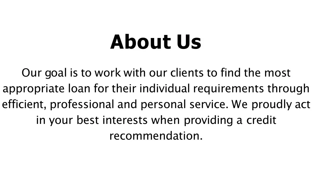 AboutUs Ourgoalistoworkwithourclientstofindthemost appropriateloanfortheirindividualrequirementsthrough efficient,professionalandpersonalservice.Weproudlyact in your best interests when providing a credit recommendation.