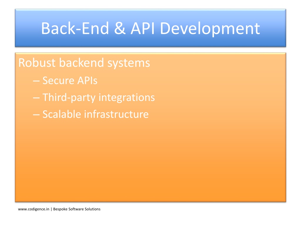 8. Back-End & API Development Robust backend systems • Secure APIs • Third-party integrations • Scalable infrastructure www.codigence.in | Bespoke Software Solutions