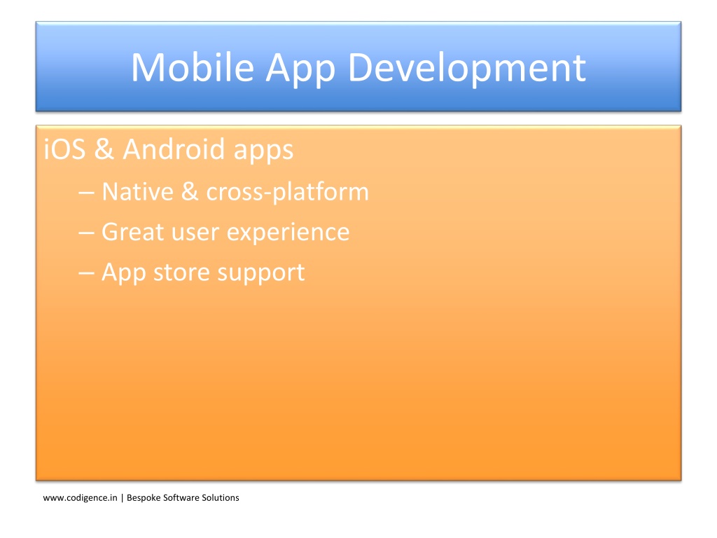 7. Mobile App Development iOS & Android apps • Native & cross-platform • Great user experience • App store support www.codigence.in | Bespoke Software Solutions