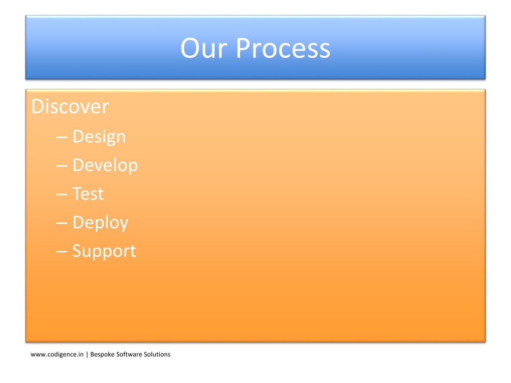 12. Our Process Discover • Design • Develop • Test • Deploy • Support www.codigence.in | Bespoke Software Solutions