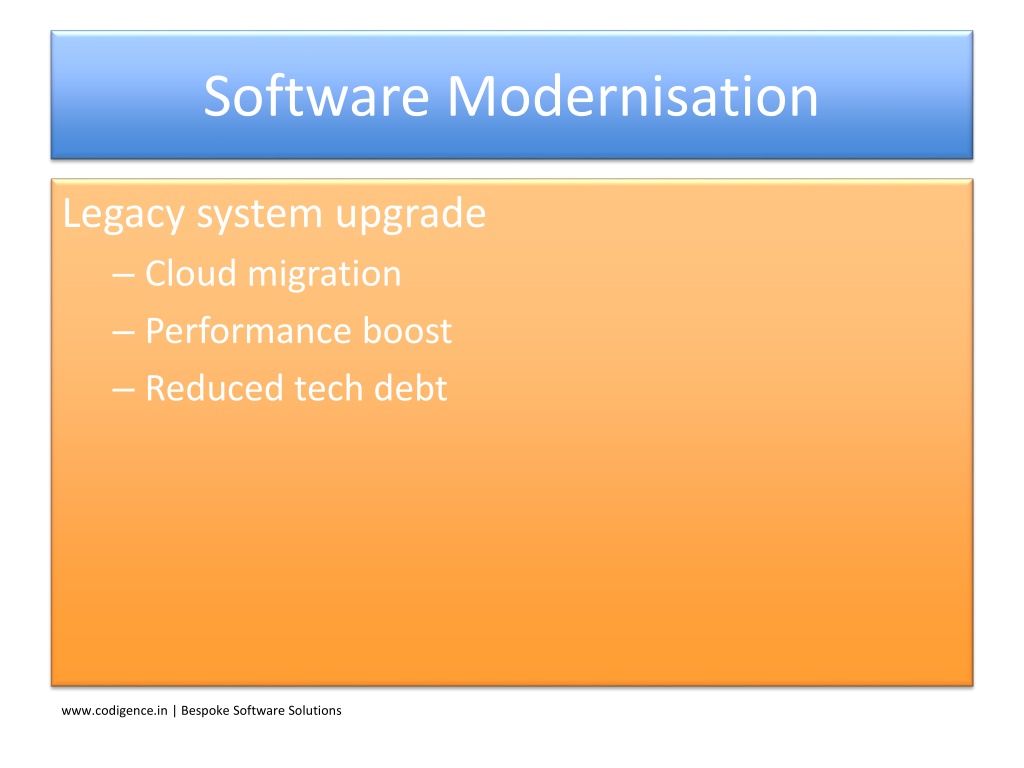 9. Software Modernisation Legacy system upgrade • Cloud migration • Performance boost • Reduced tech debt www.codigence.in | Bespoke Software Solutions