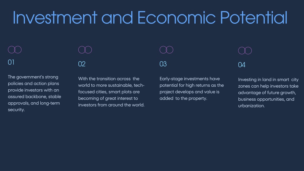 01 • 02 • 03 • 04 • Investment and Economic Potential • The government's strong policies and action plans provide investors with an assured backbone, stable approvals, and long-term security. • With the transition across the world to more sustainable, tech-focused cities, smart plots are becoming of great interest to investors from around the world. • Early-stage investments have potential for high returns as the project develops and value is added to the property. • Investing in land in smart city zones can help investors take advantage of future growth, business opportunities, and urbanization.