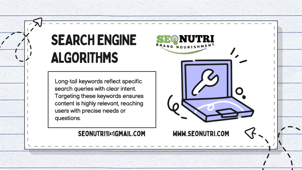 4. SEARCH ENGINE ALGORITHMS Long-tail keywords reflect specific search queries with clear intent. Targeting these keywords ensures content is highly relevant, reaching users with precise needs or questions. seonutri1@gmail.com www.seonutri.com
